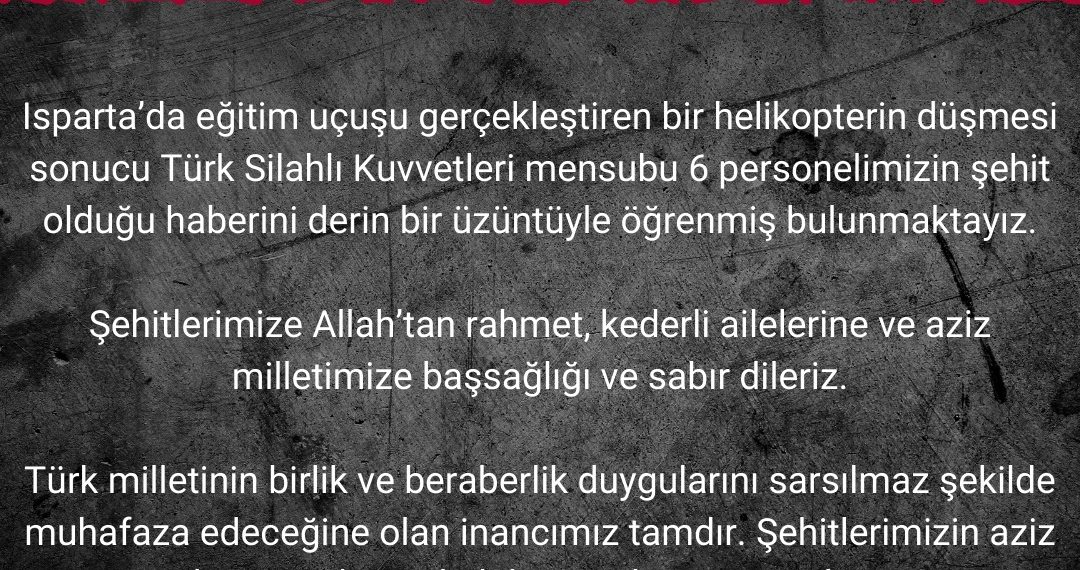 Isparta’da eğitim uçuşu gerçekleştiren bir helikopterin düşmesi sonucu Türk Silahlı Kuvvetleri mensubu 6 personelimizin şehit olduğu haberini derin bir üzüntüyle öğrenmiş bulunmaktayız.