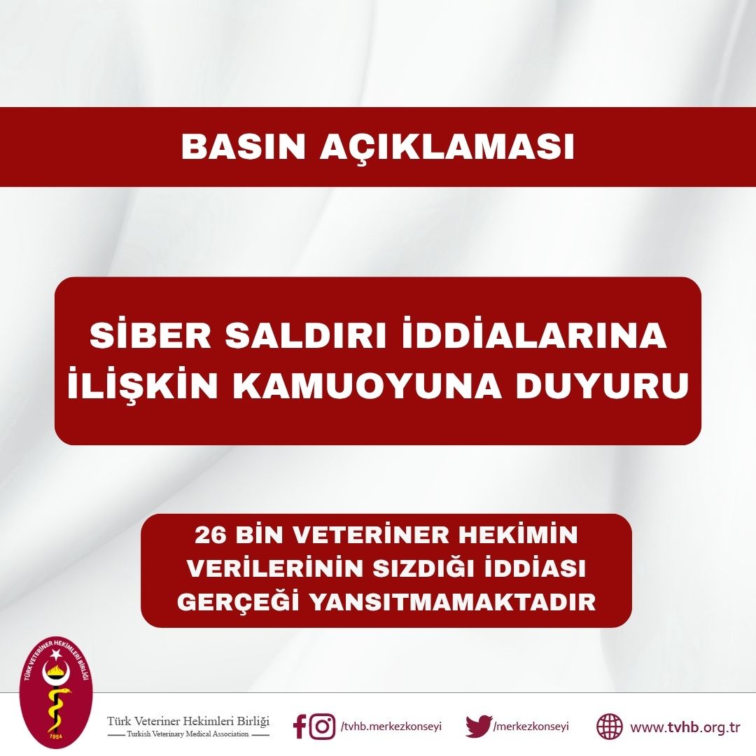 Bazı basın yayın organlarında ve internet haber sitelerinde, “Türk Veteriner Hekimleri Birliği’ne siber saldırı düzenlendi, 26 bin veteriner hekimin kişisel verileri çalındı” başlığıyla yayımlanan haberler üzerine kamuoyunun doğru bilgilendirilmesi amacıyla bu açıklamanın yapılması zaruri hale gelmiştir.