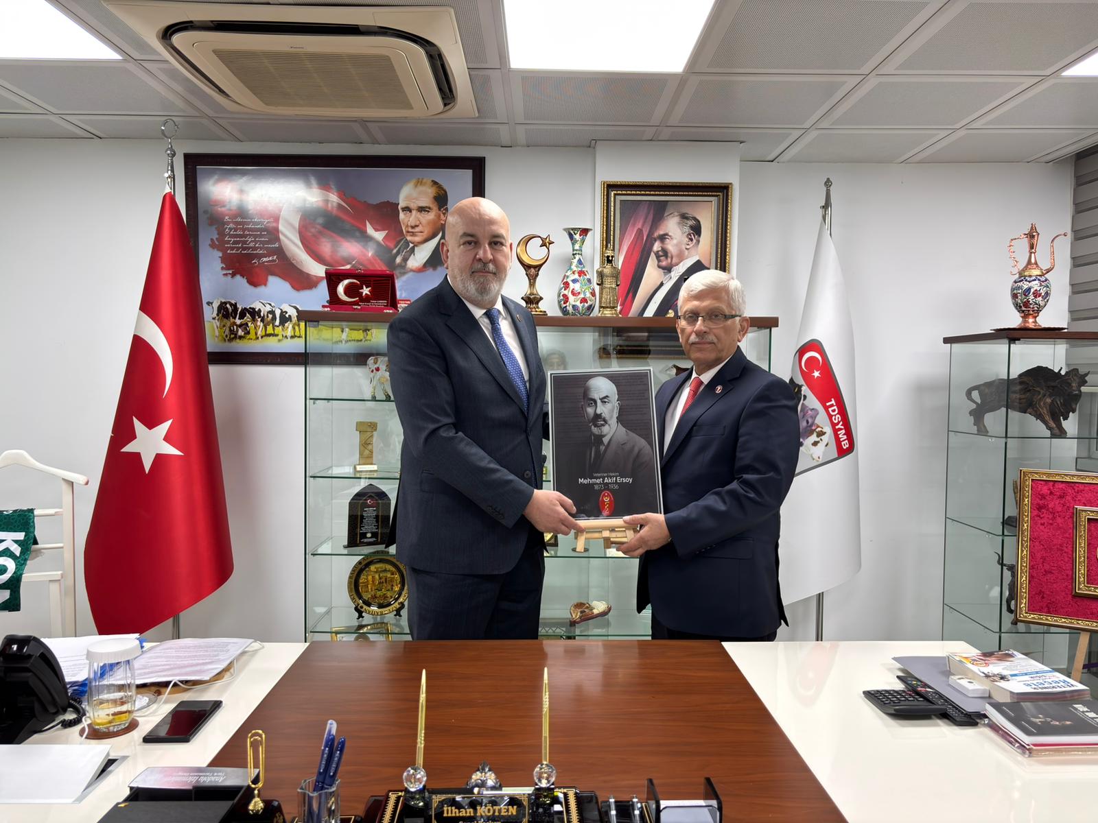 Türk Veteriner Hekimleri Birliği Merkez Konseyi Başkanı Ali EROĞLU, Genel Sekreter Prof. Dr. Hüsamettin EKİCİ, Merkez Konseyi Üyeleri Dr. Ömer Faruk SARI ve Önder YILDIZ, Türkiye Damızlık Sığır Yetiştiricileri Merkez Birliği Genel Başkanı İlhan KÖTEN’e hayırlı olsun ziyaretinde bulundu. Ziyarette Genel Başkan Yardımcısı Bekir KAYAN da yer aldı.