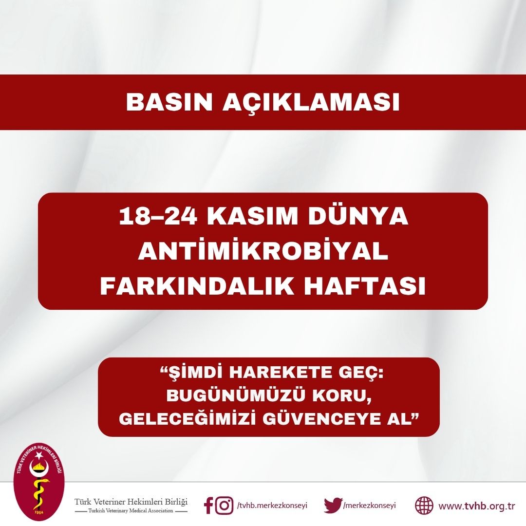 Tüm dünyada olduğu gibi ülkemizde de halk sağlığını, hayvan sağlığını, gıda güvenliğini ve ekonomiyi tehdit eden en büyük tehlikelerden biri olan Antimikrobiyal Direnç sorununa dikkat çekmek amacıyla, her yıl 18-24 Kasım tarihleri arası Dünya Antimikrobiyal Farkındalık Haftası olarak anılmaktadır. Türk Veteriner Hekimleri Birliği olarak; bu yılki küresel tema olan “Şimdi Harekete Geç: Bugünümüzü Koru, Geleceğimizi Güvenceye Al” çağrısı vesilesiyle acil ve koordineli eylemin önemini bir kez daha hatırlatıyoruz. Bu tema, bugünün ve geleceğin risk faktörlerini omuzlayan tüm sorumluları göreve davet eden çok açık ve net bir çağrıdır.