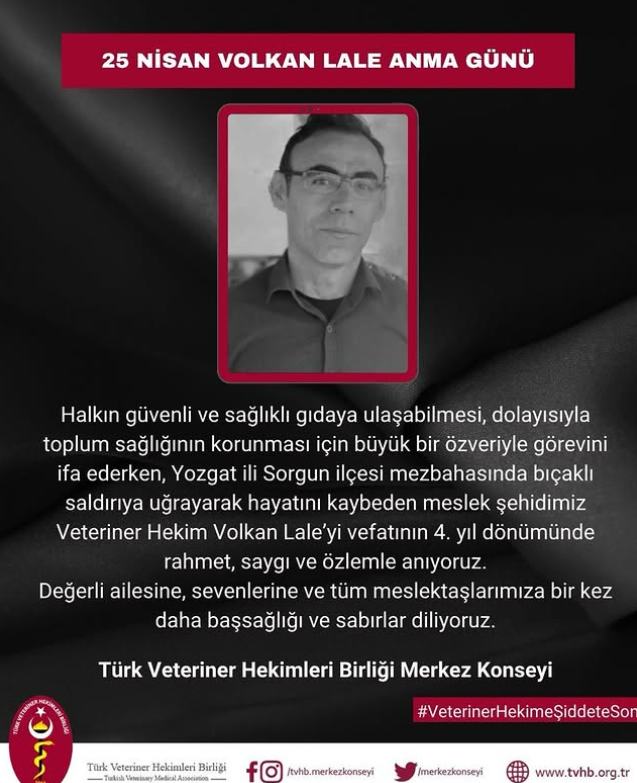 Halkın güvenli ve sağlıklı gıdaya ulaşabilmesi, dolayısıyla toplum sağlığının korunması için büyük bir özveriyle görevini ifa ederken, Yozgat ili Sorgun ilçesi mezbahasında bıçaklı saldırıya uğrayarak hayatını kaybeden meslek şehidimiz Veteriner Hekim Volkan Lale’yi vefatının 4. yıl dönümünde rahmet, saygı ve özlemle anıyoruz.