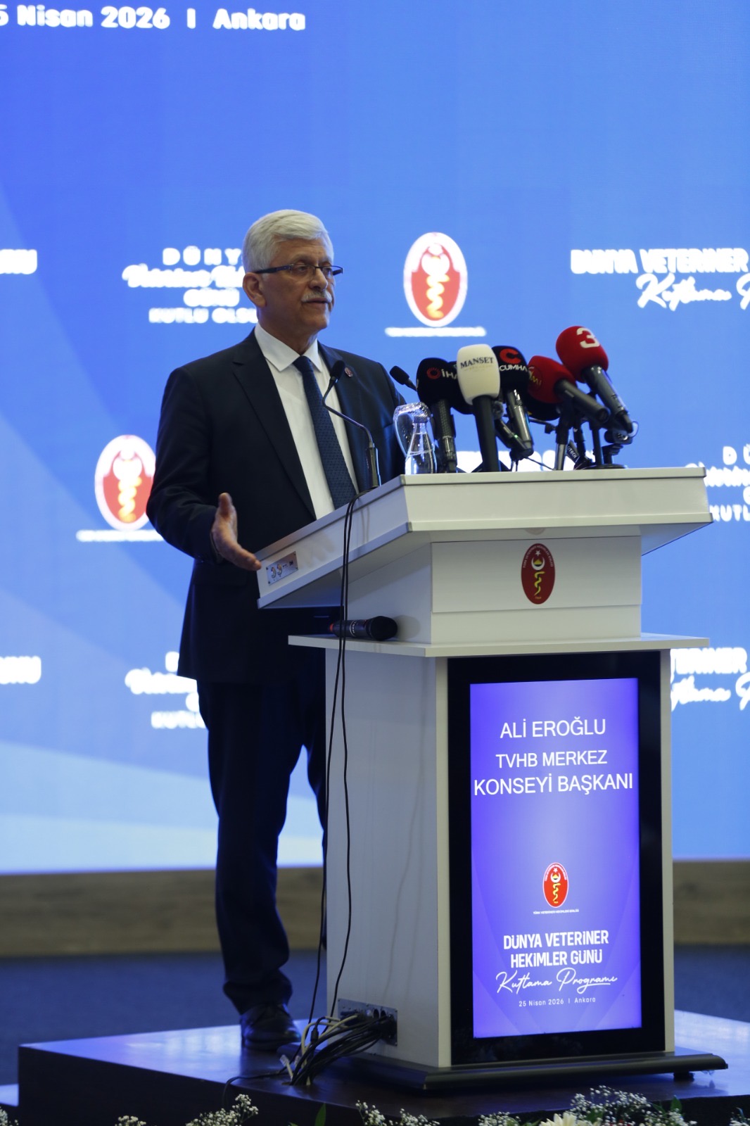TVHB Merkez Konseyi Başkanı Ali Eroğlu konuşmasında, Dünya Veteriner Hekimler Günü’nün meslek açısından küresel ve ulusal ölçekte hayvancılığın, gıda güvenliğinin, halk sağlığının ve çevresel risklerin değerlendirildiği önemli bir platform olarak ele alınması gerektiğini ifade etti. Dünya genelinde milyonlarca veteriner hekimin aynı gün ortak bir bilinçle hareket ettiğini hatırlatan Eroğlu, bu özel günün mesleğin görünürlüğünü artıran ve toplumsal farkındalığı güçlendiren bir anlam taşıdığını vurguladı.