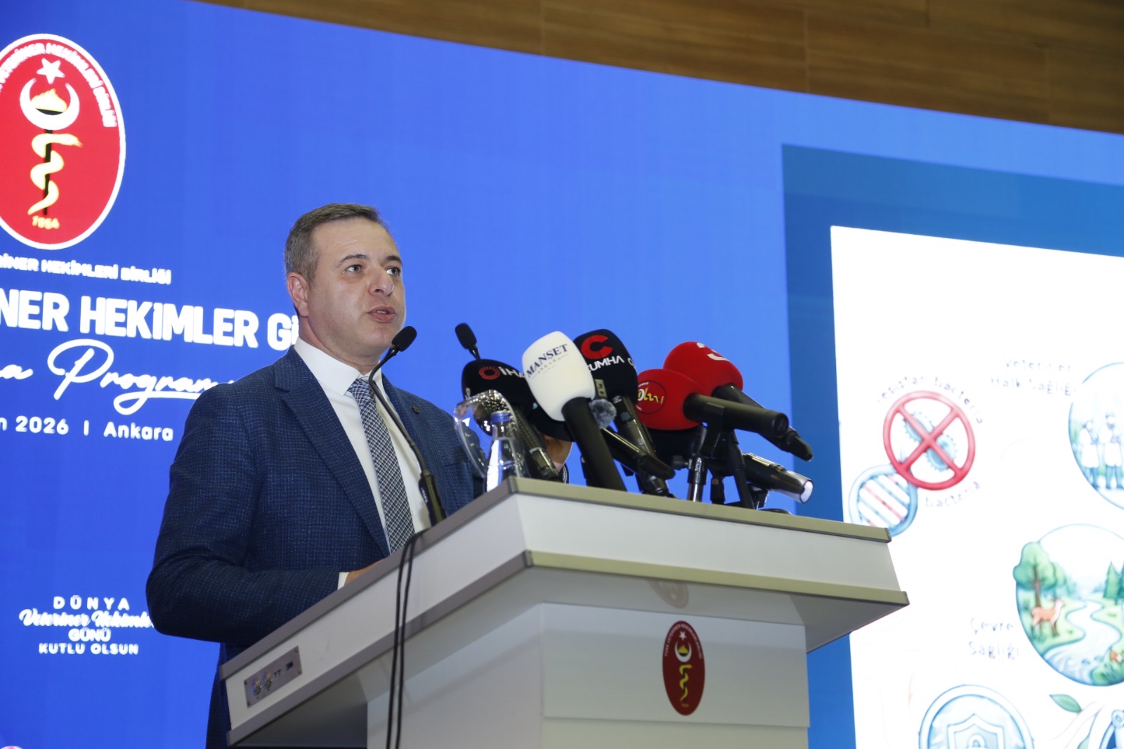 Programda konuşan Tarım ve Orman Bakan Yardımcısı Prof. Dr. Ahmet Gümen ise Dünya Veteriner Hekimler Günü vesilesiyle meslek mensuplarıyla bir arada bulunmaktan duyduğu memnuniyeti ifade ederek, veteriner hekimliğin günümüzde stratejik bir alan haline geldiğini vurguladı. Gıda güvenliği ve halk sağlığının sürdürülebilirliğinin, güçlü bir veteriner hekimlik sistemi ile doğrudan ilişkili olduğunu belirten Gümen, bu alandaki hizmetlerin kamu politikalarının temel unsurlarından biri olduğunu dile getirdi.